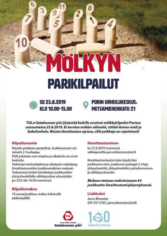 Mölkky - parikilpailu järjestetään su 25.8.2019 alkaen klo 10, Porin Isomäessä. Ilmoittautumiset ke 22.8 mennessä jarno.blomster(at)tul.fi. Tapahtuma on yksi TUL Satakunnan piiri ry:n 100v juhlatapahtuma. Lisätietoja : Päivi Luontola p. 0400817114. Liitteenä tarkempi esite. Tervetuloa! Liitteet